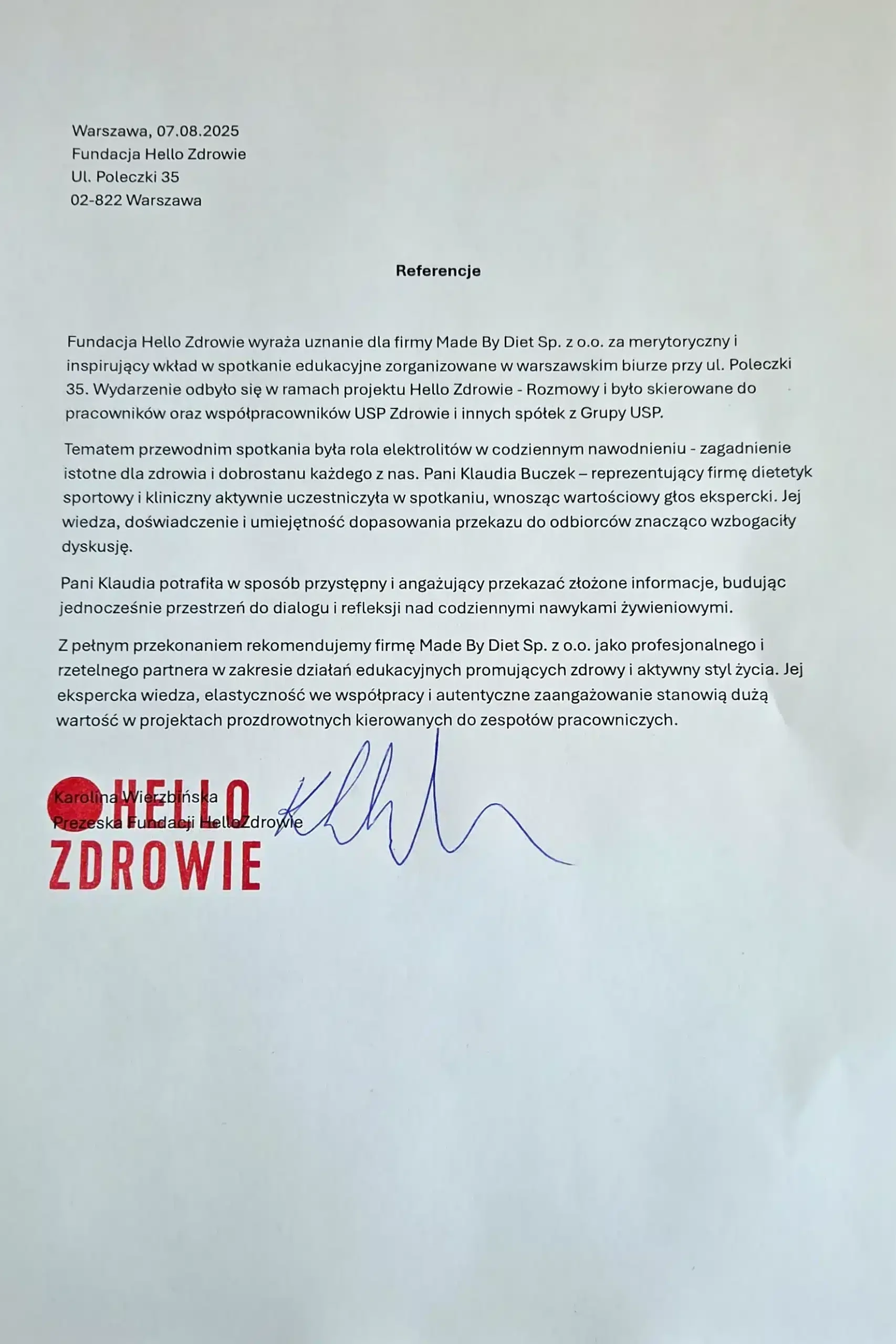 Współprace wellbeingowe dla firm koordynuje mgr inż. Klaudia Buczek – dietetyk kliniczny i sportowy, współzałożycielka poradni Made By Diet®, z 9-letnim doświadczeniem. Na co dzień łączy wiedzę z praktyką, wspierając firmy w tworzeniu angażujących i skutecznych działań prozdrowotnych. Chętnie doradzi, jak najlepiej zadbać o zdrowie Twojego zespołu.