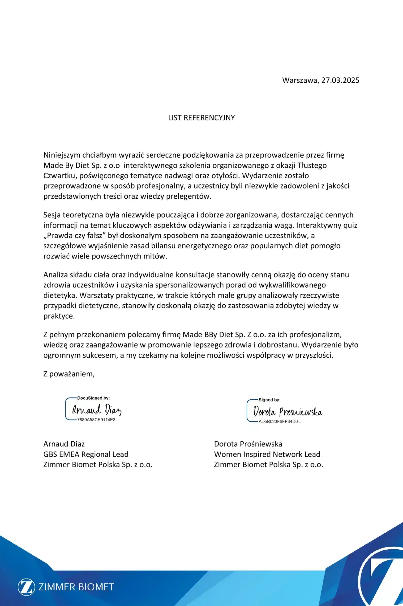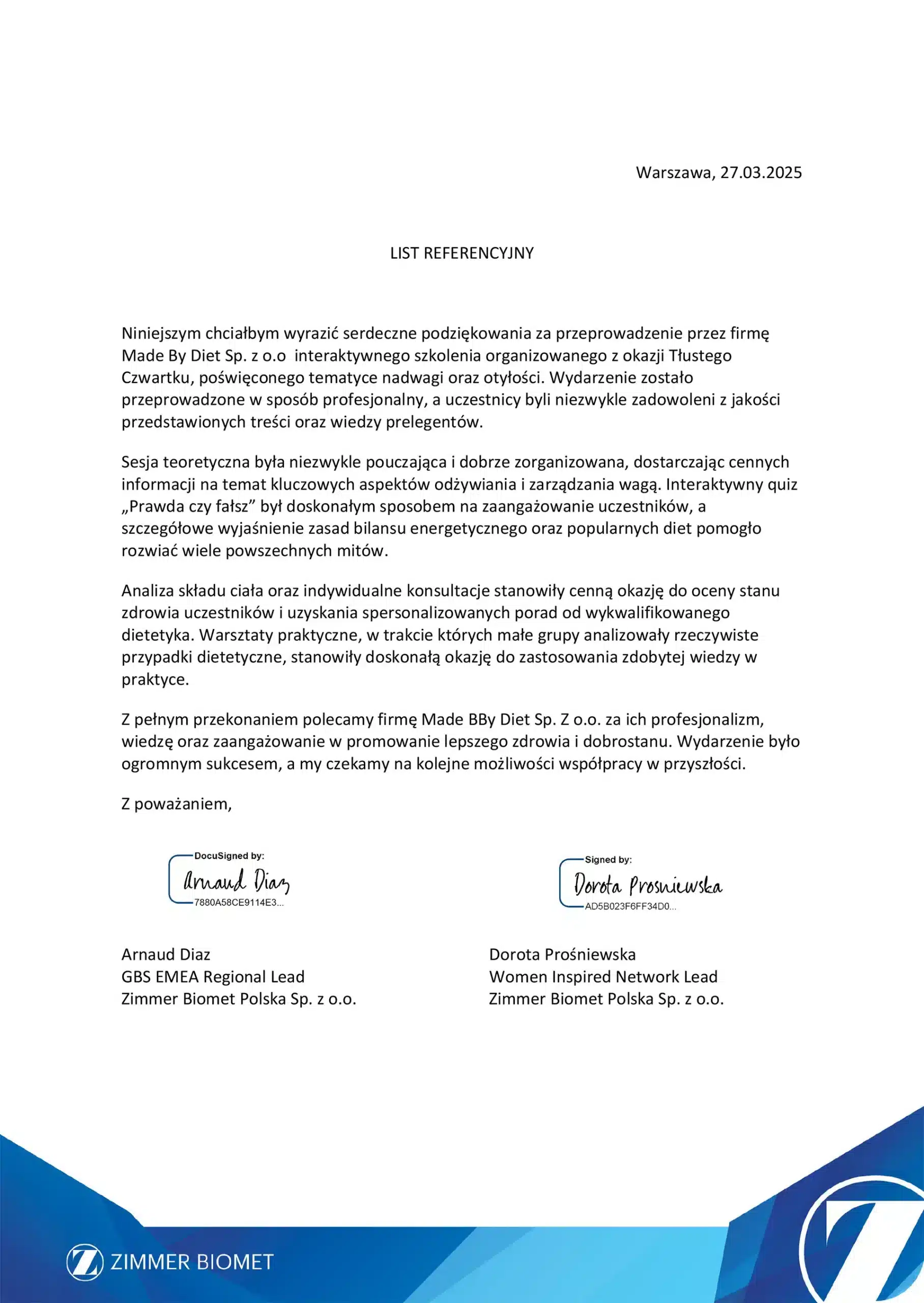 Nasze warsztaty cieszą się uznaniem wśród firm. Przykładowo, w międzynarodowej korporacji Zimmer Biomet zrealizowaliśmy modułowe szkolenie poświęcone prewencji otyłości, które spotkało się z bardzo pozytywnym odbiorem wśród pracowników. Warsztat prowadzony był w języku angielskim.