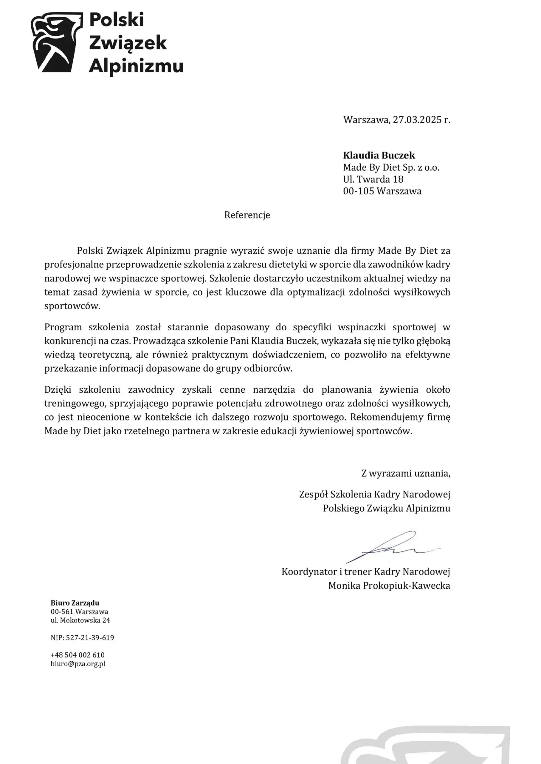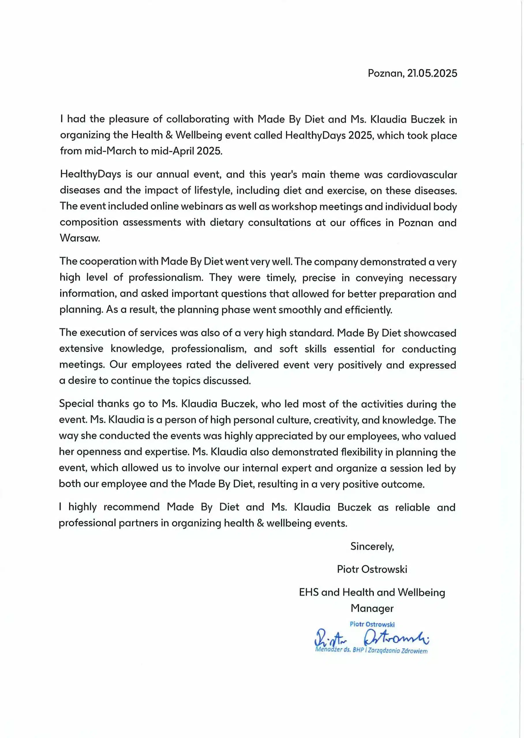 Our company wellbeing partnerships are coordinated by Klaudia Buczek, MSc Eng – clinical and sports dietitian, co-founder of Made By Diet®, with 9 years of experience. She combines science with practice, helping companies create engaging and effective wellbeing initiatives. She’ll be happy to advise you on how to best support your team’s health.